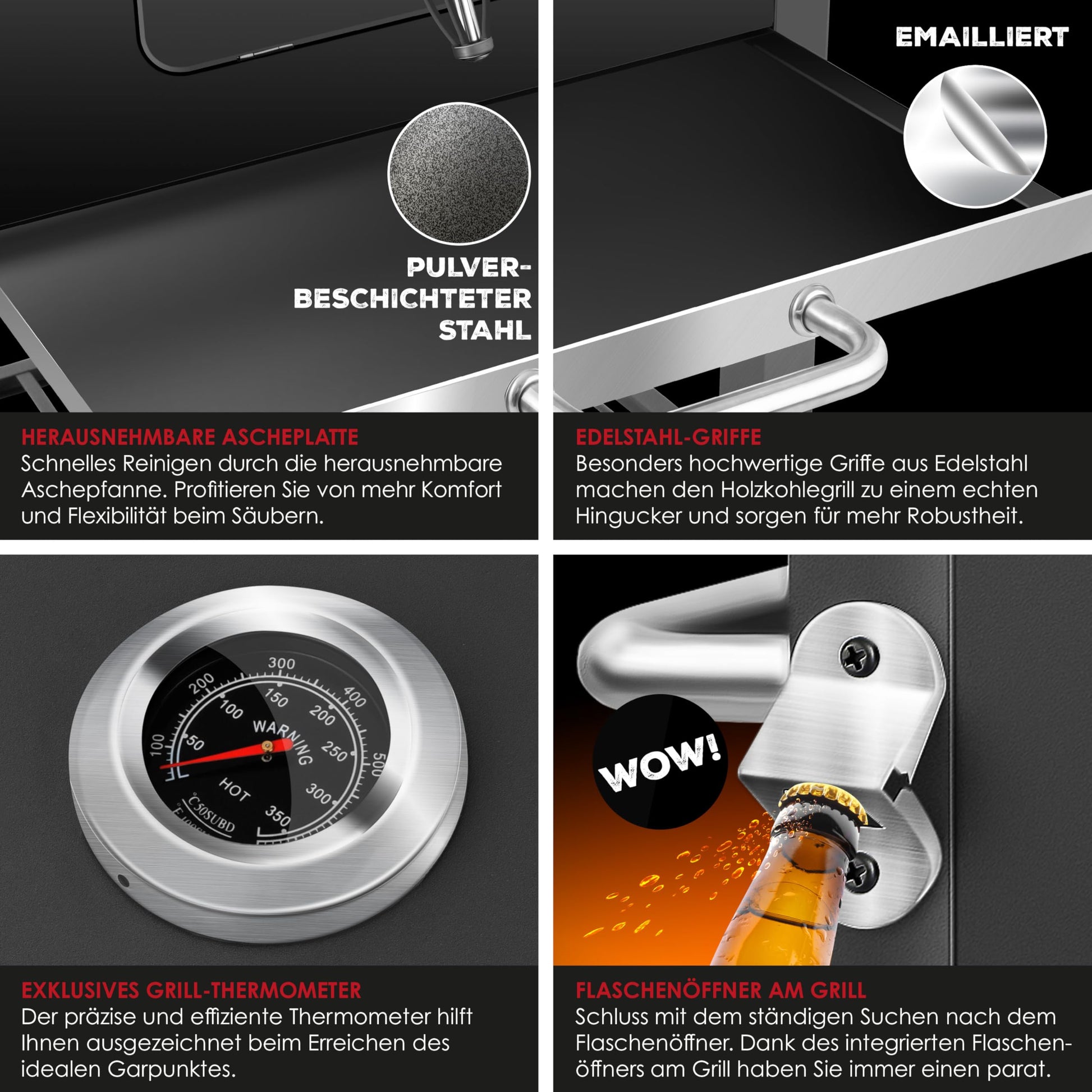 Parrilla de Carbón con Carrito y Tapa – BBQ XL con Ruedas, Termómetro y Estante Abatible – Acero Inoxidable Negro – KESSER®